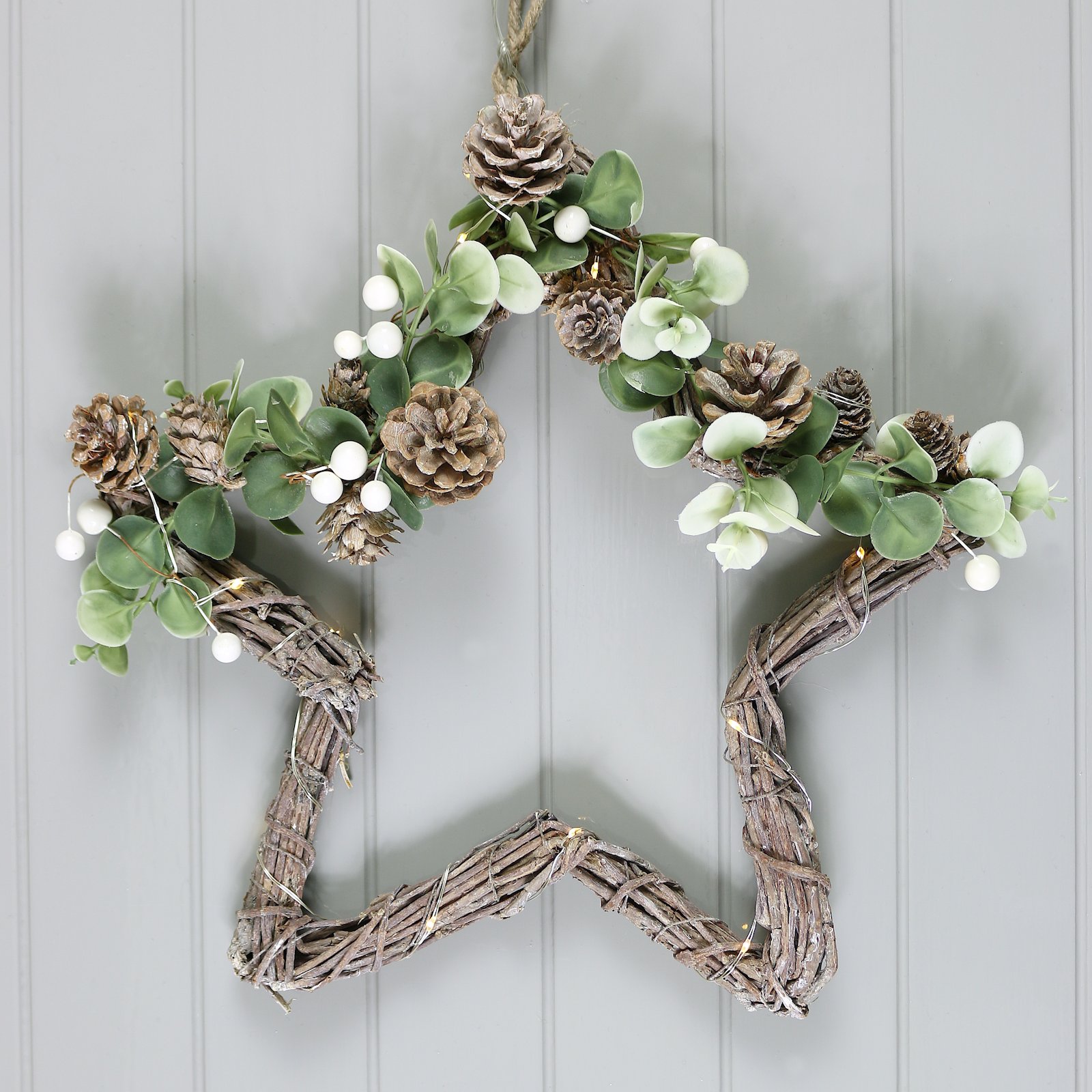 Christmas Star Twig Decoration LED Lights Pine Cones Rattan White Berries 30cm