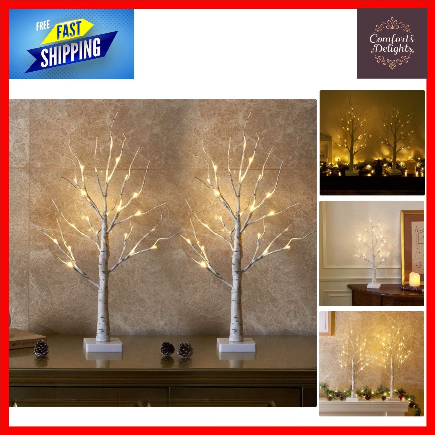 Eambrite Set of 2 Small Birch Twig Tree Lights Photo Display Tree with 24 Warm