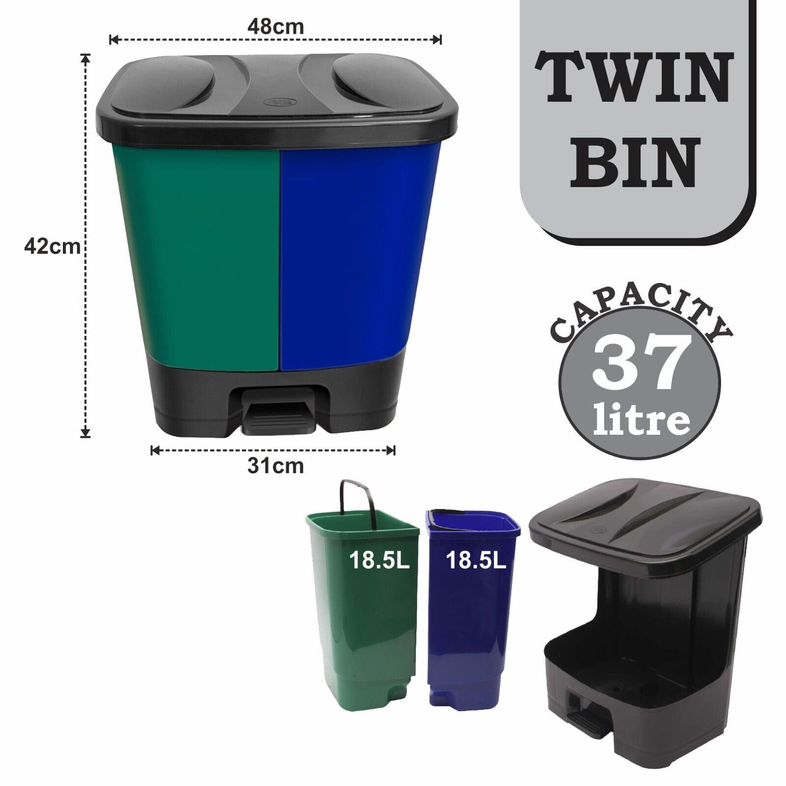 37L Twin Bin Recycling Foot Pedal Bin Dry Wet Kitchen Waste - Green + Blue