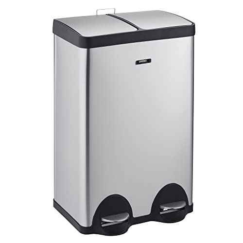 Cooks Professional Dual Pedal Recycle Bin 60L | 2 x 30L Removable Compartments & Soft Close Lids | Twin Double Section Stainless Steel Kitchen or Office Dustbin for Recycling or Waste | Silver