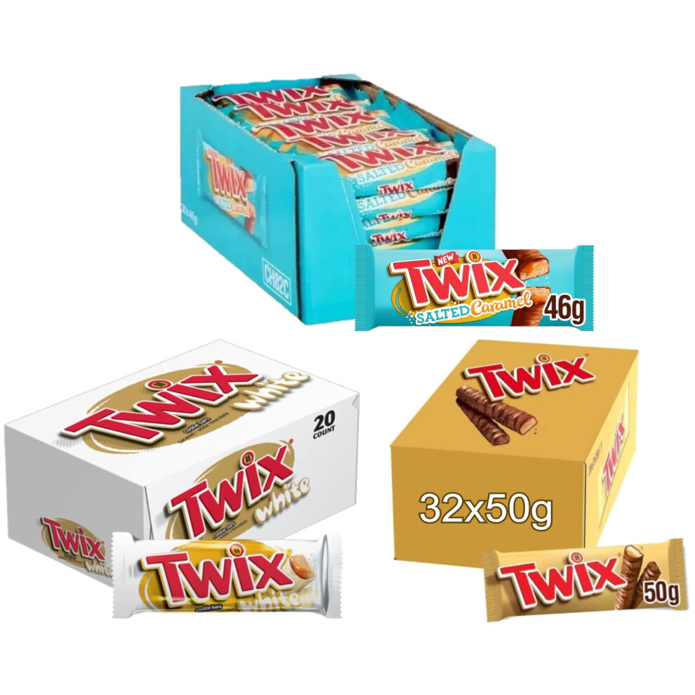 Twix Milk Chocolate Bars with Biscuit & Caramel, Bulk Chocolate, Standard Twin Twix 32x50g & White Twin 20x46g & Salted Caramel Twin 30x46g