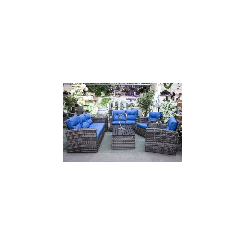 SH&G Edgerton 7 Seater Sofa Set | 6 Piece Table, Chairs & Sofa | Brown Rattan with Blue Cushions | Indoor & Outdoor | Signature Homes and Gardens