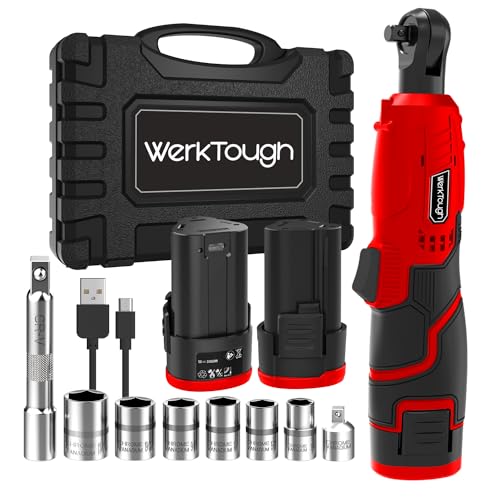 werktough Power Cordless Ratchet Wrench 3/8" Tool Kit with 2 Pack Li-ion Batteries with 6 Sockets, Extension Bar and 1 Type C USB Cable Red