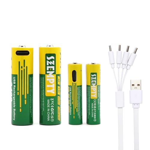 SZEMPTY 2 AA+2 AAA Lithium Rechargeable Batteries, 1.5V Li-ion USB high capacity Battery AA 3400mWh & AAA 900 mWh for Remote Control, Toys, Keyboards etc, 4 in 1 typeC charging cable included.