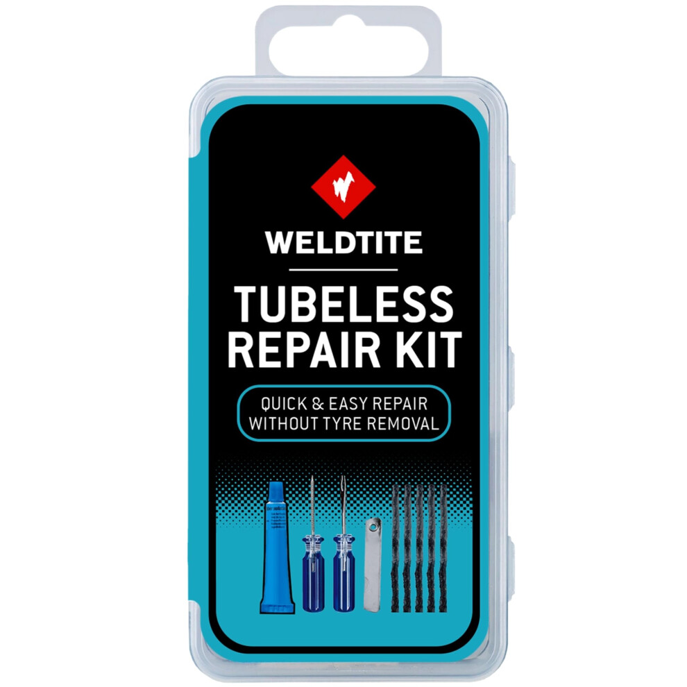 WELDTITE Tubeless Bike Tyre Repair Kit - Quick & Easy Fix Without Tyre Removal - Includes Mending Strings, Rasp & Split Eye Tools, Rubber Solution &