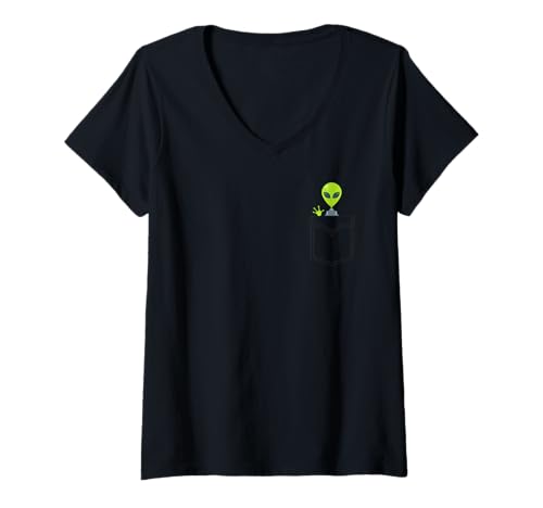Womens Little Alien Pocket, ET, Spaceship, Area 51 UFO, UAP, Drone V-Neck T-Shirt