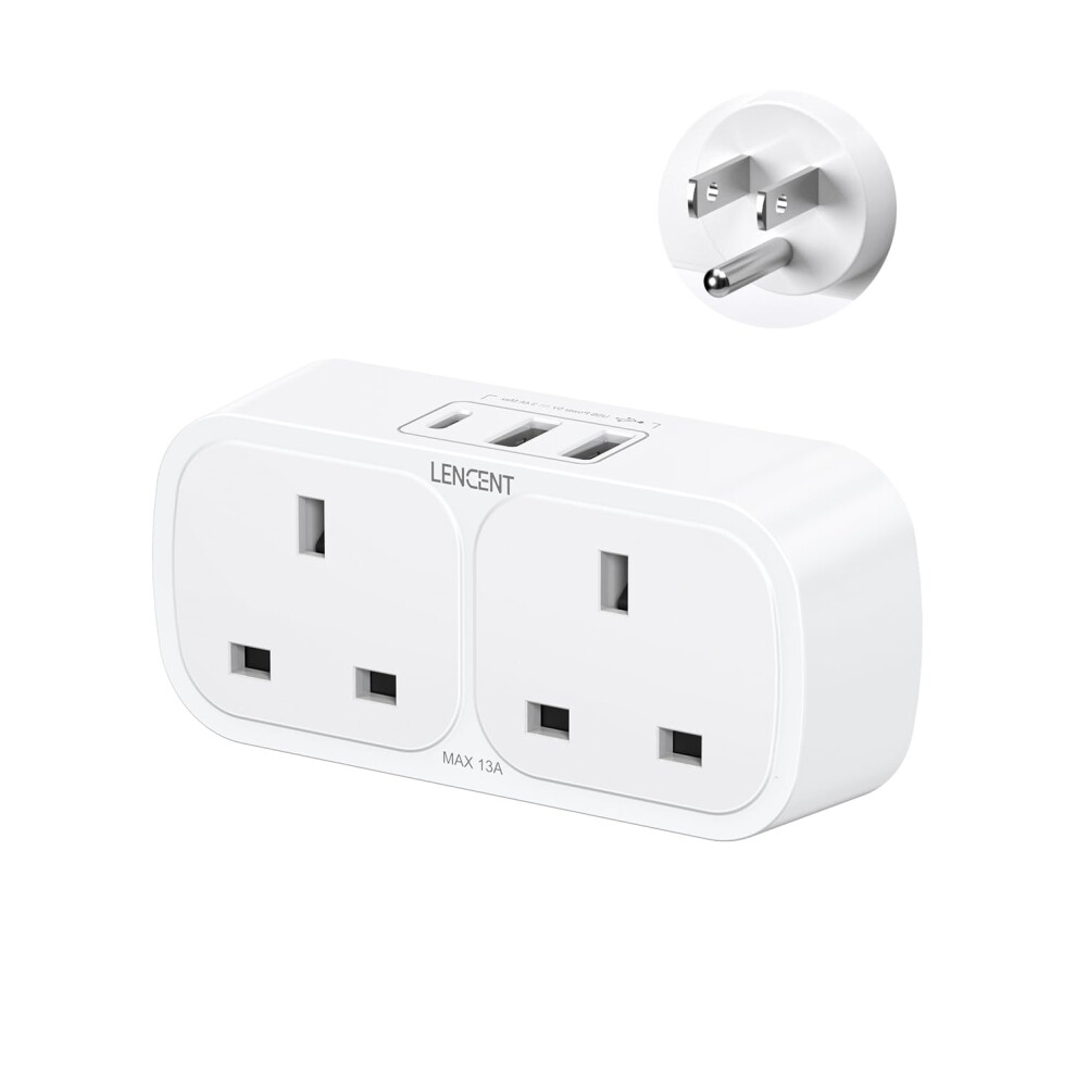 LENCENT UK to US USA Plug Adaptor with 1 Type C and 2 USB Ports, 2 Way Grounded America Travel Adapter for the United States, Mexico, Canada, Thailan
