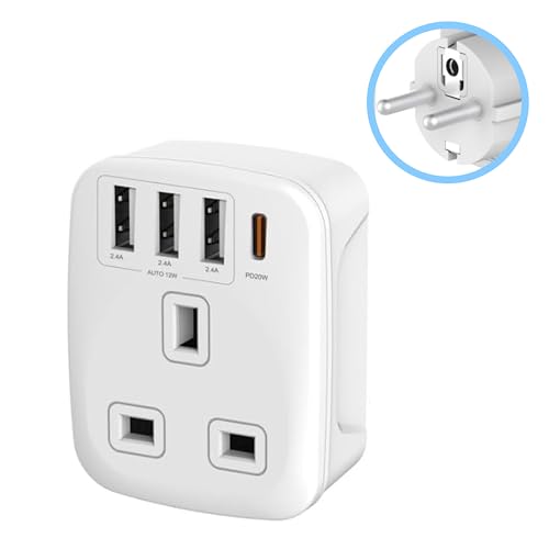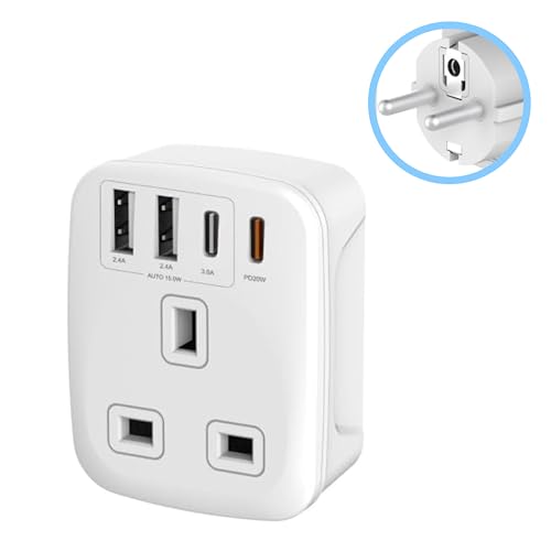 UK to European Travel Adaptor with 4 USB Ports(1 USB C), Grounded EU Euro Europe to UK Power Plug Adapter for Germany Spain France Iceland Greece Poland Netherlands Austria Turkey etc (Type E/F)