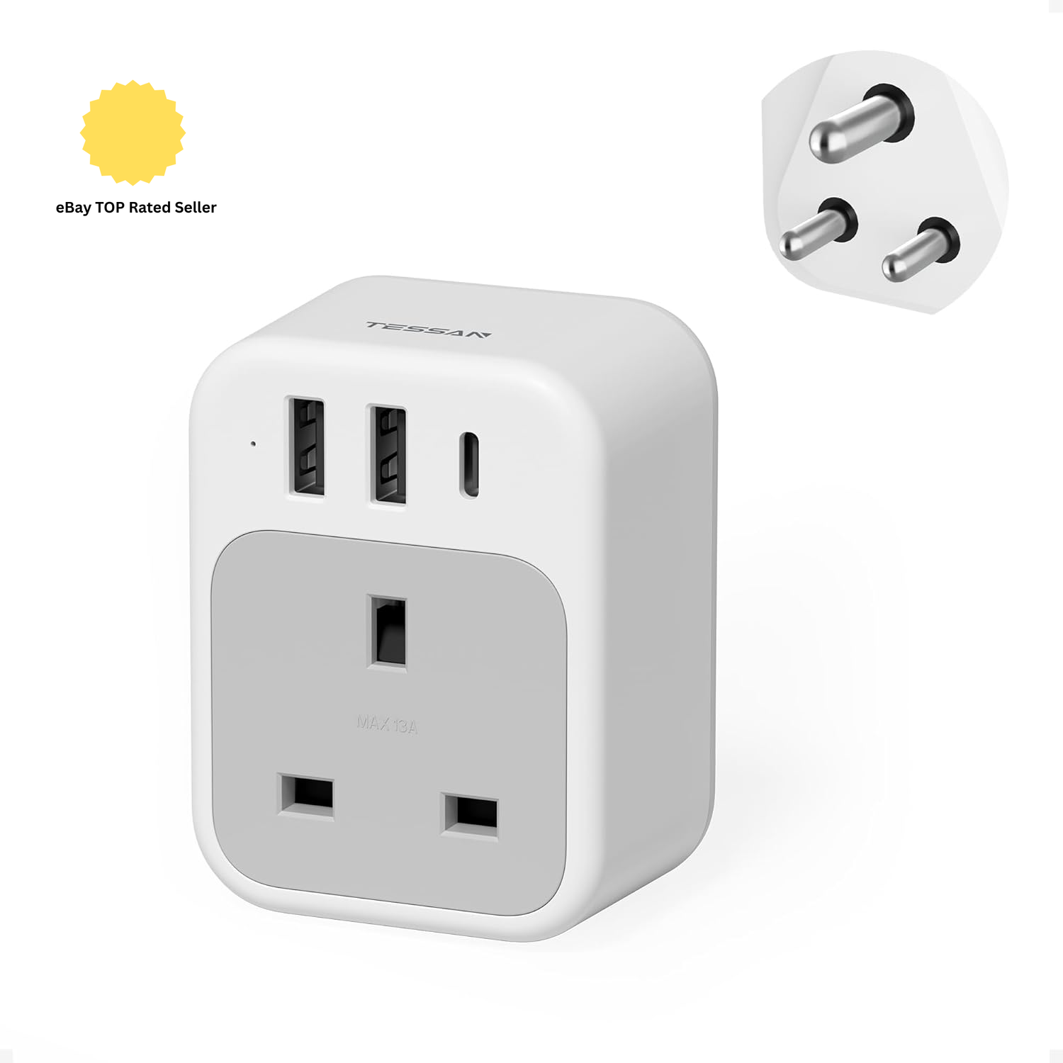 UK to India Plug Adapter with 3 USB Ports 32W USB C Fast Travel Charger, Adaptor