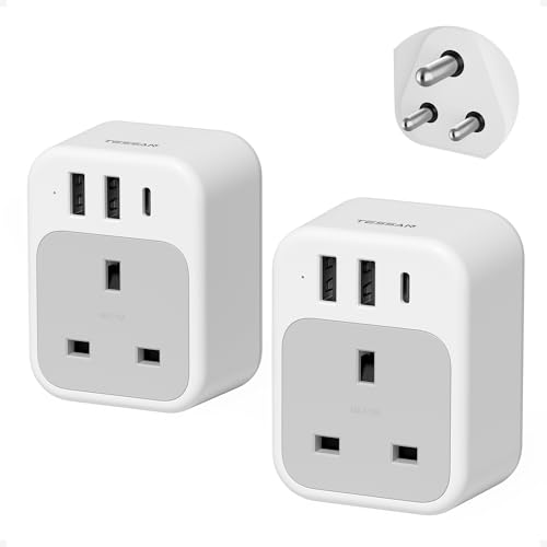 UK to India Plug Adapter, TESSAN Type D Travel Adaptor with 3 USB Ports (1 USB C), Indian 2 Way 3 Pin Grounded Adapter for Sri Lanka, Pakistan, Nepal, Maldives, Iraq, Namibia, Burma, Yemen