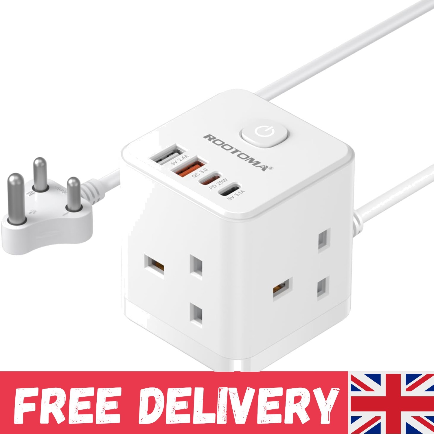 Versatile 7-Port UK to India Plug Adapter with 2500W Capacity & 1.5M Cable