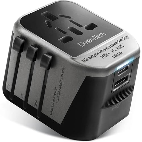 Desiretech Travel Adaptor - 4-in-1 Universal Plug Adapter with USB-A, USB-C, Phone Docking - Compact UK to World Adaptor, Double Fuse Protection - Perfect for Europe, USA, Asia & Beyond (Black/Grey)