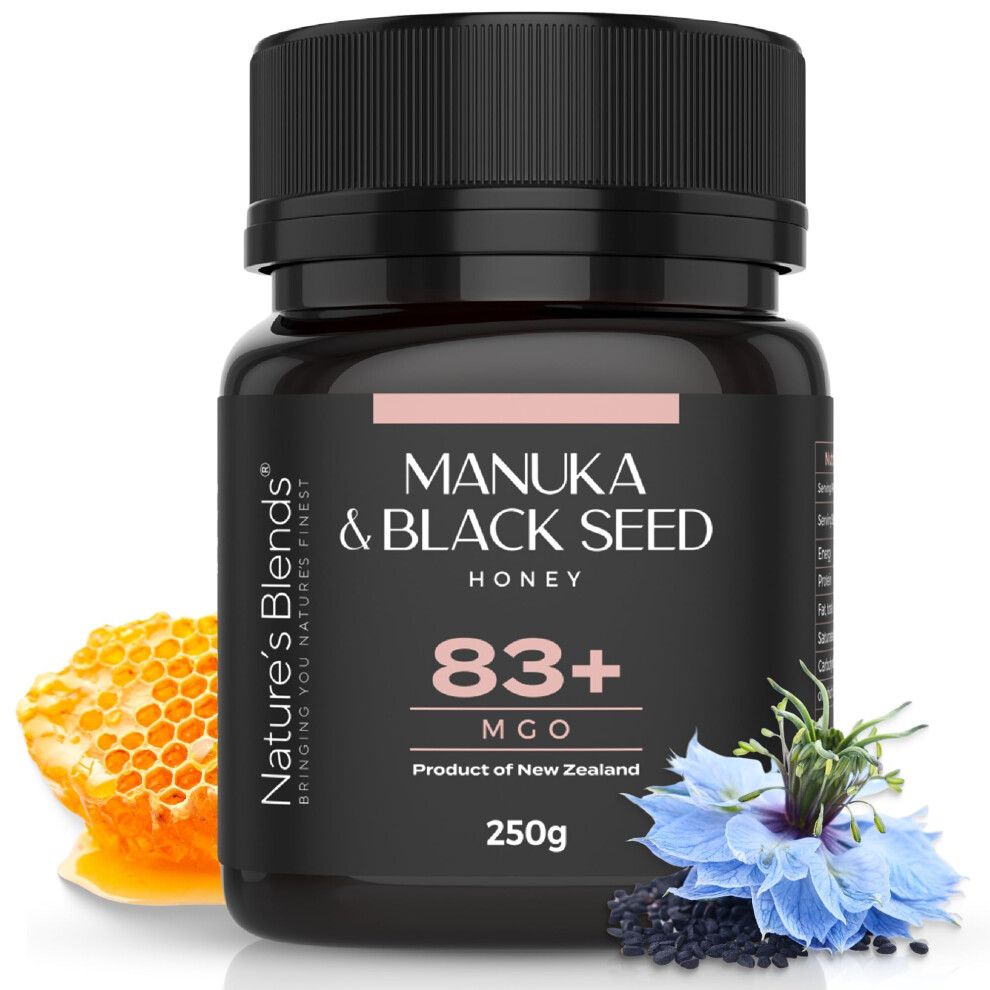 Nature's Blends Black Seed & Manuka Honey MGO 83+ | Cold-Pressed Black Seed Oil Infused Raw Honey for Skin, Hair & Overall Wellness | Ideal for Daily