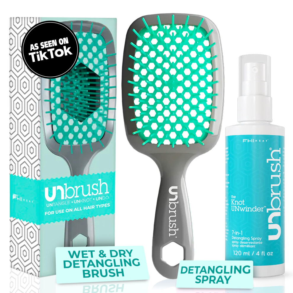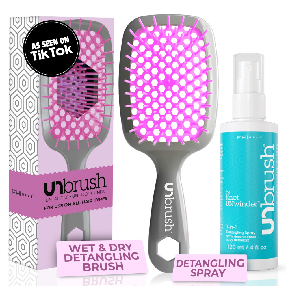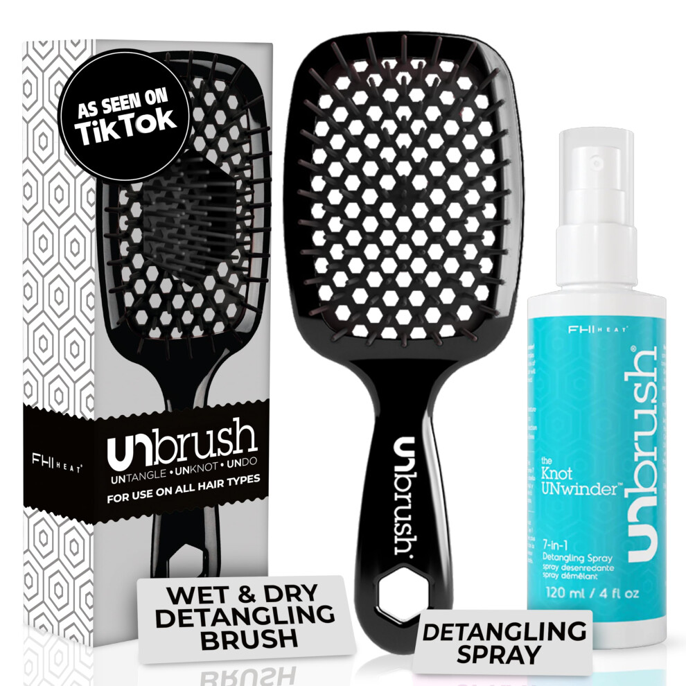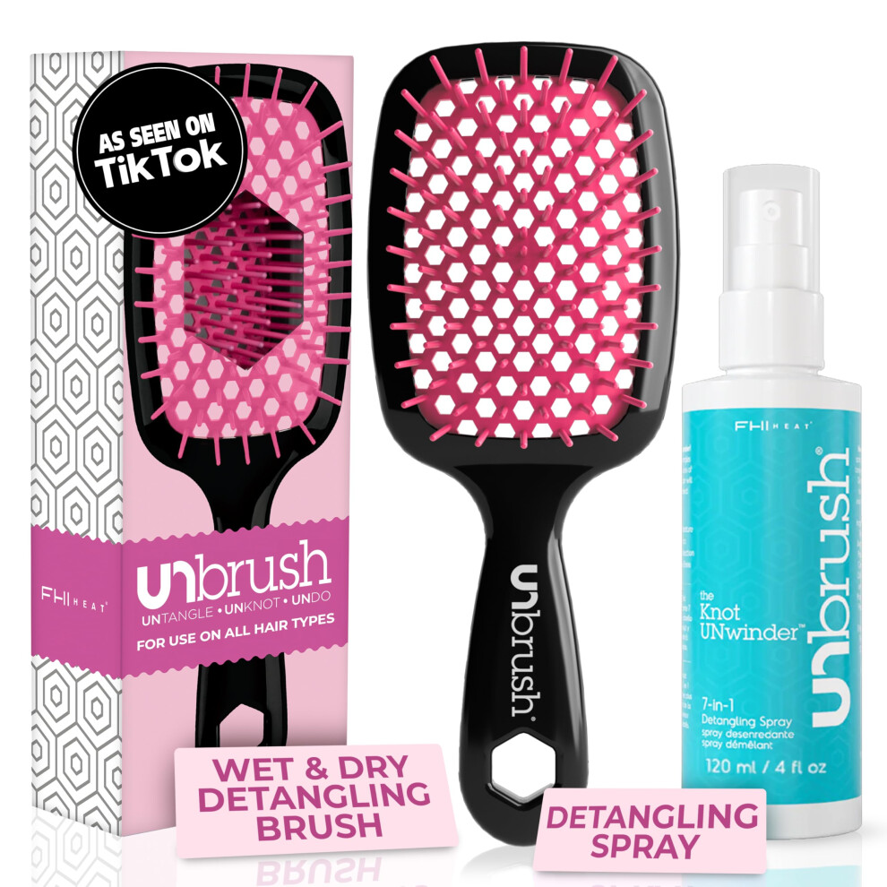 FHI Heat UNbrush Detangling Brush and UNwinder Detangling Spray Combo Pack - Tangle-Free Hair Pain-Free Brushing Anti-Static Bristles Lightweight H