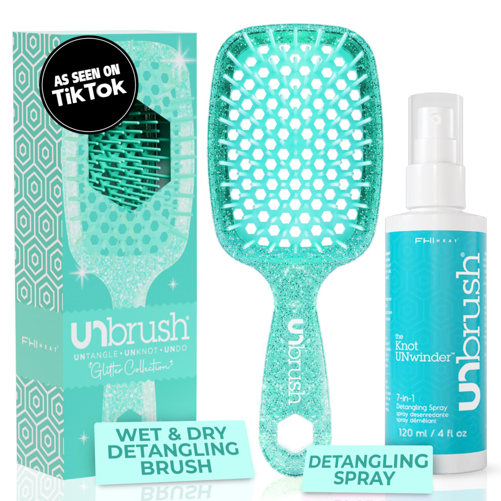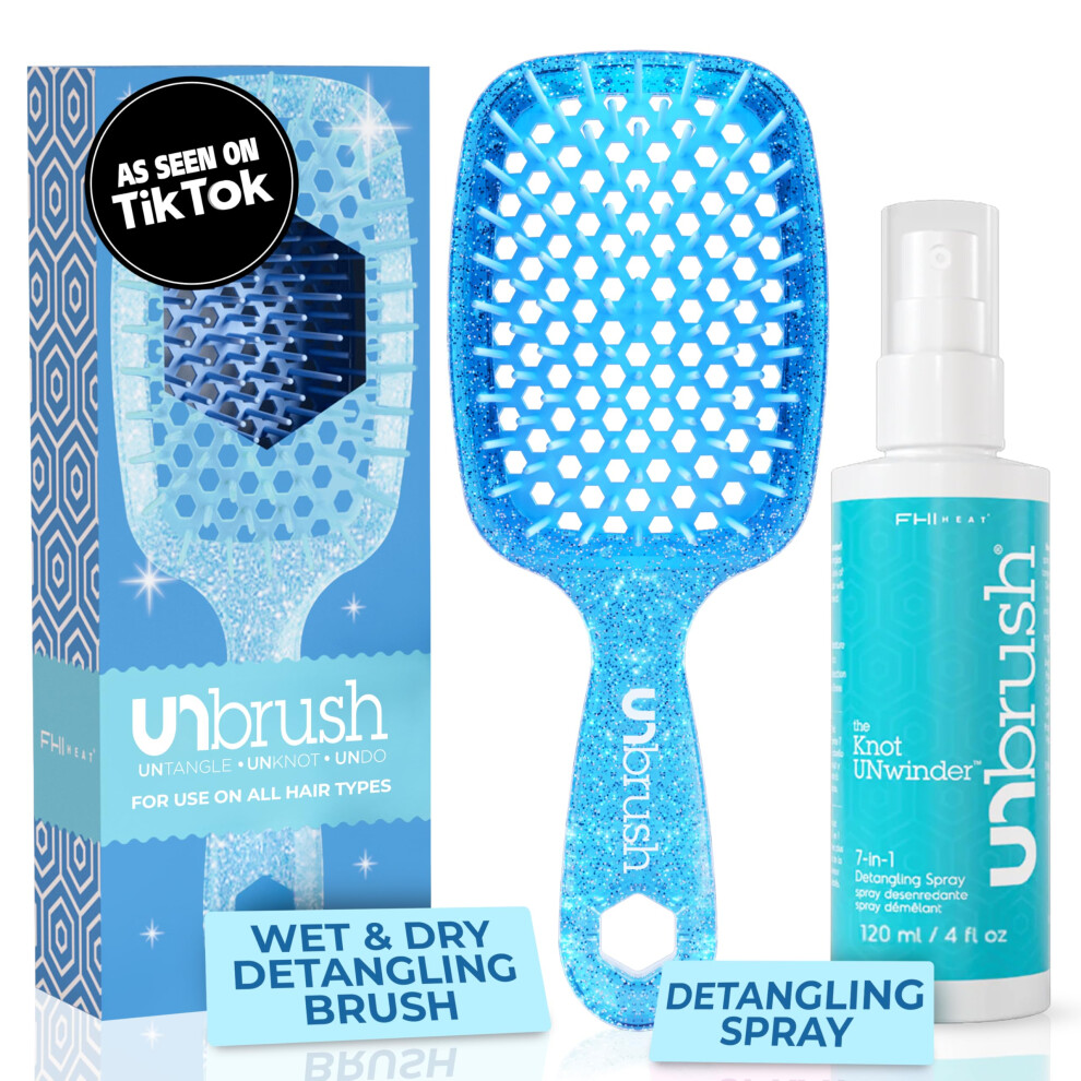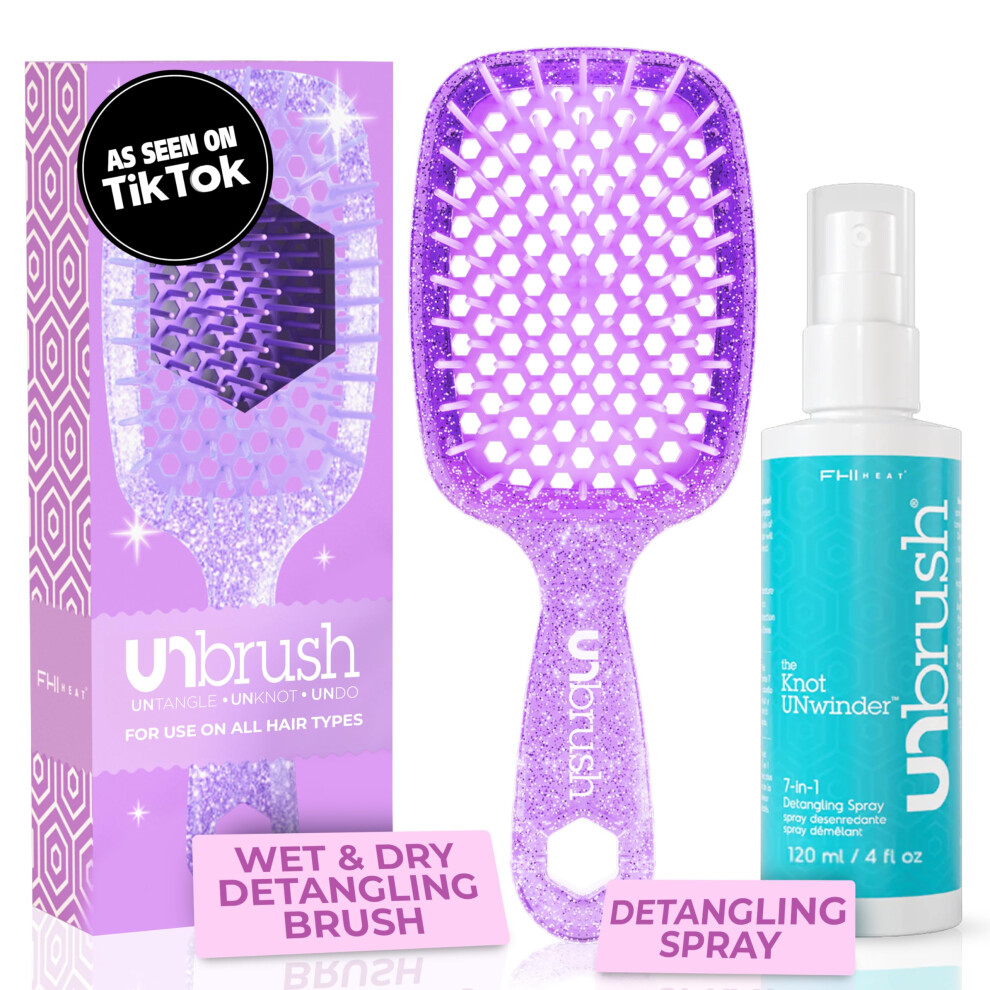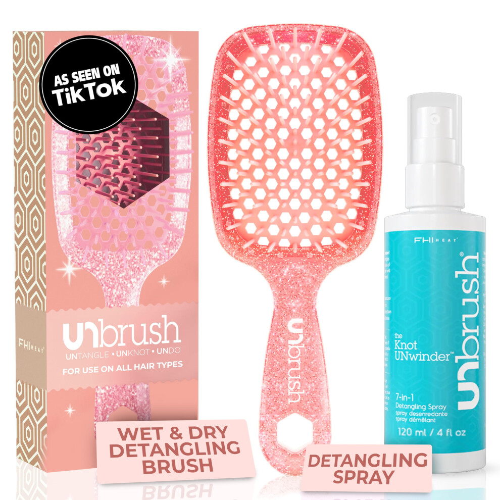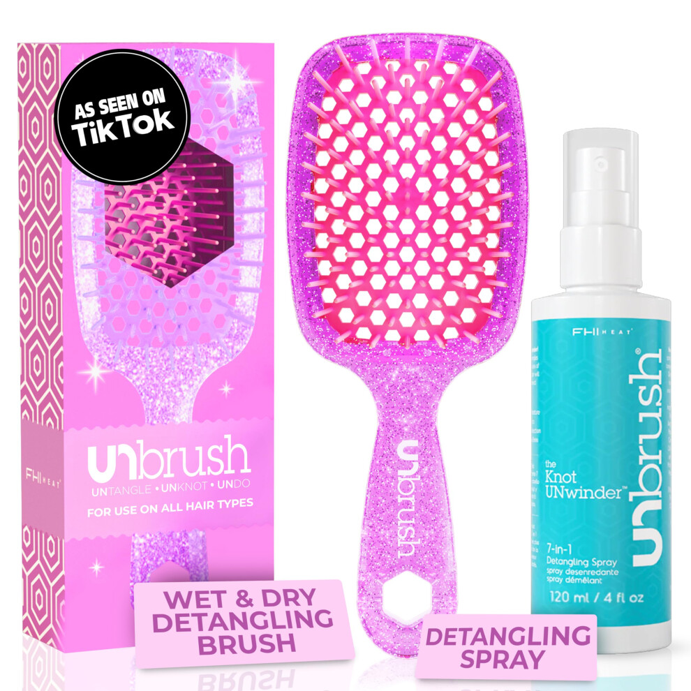FHI Heat UNbrush Detangling Brush and UNwinder Detangling Spray Combo Pack - Tangle-Free Hair Pain-Free Brushing Anti-Static Bristles Lightweight H