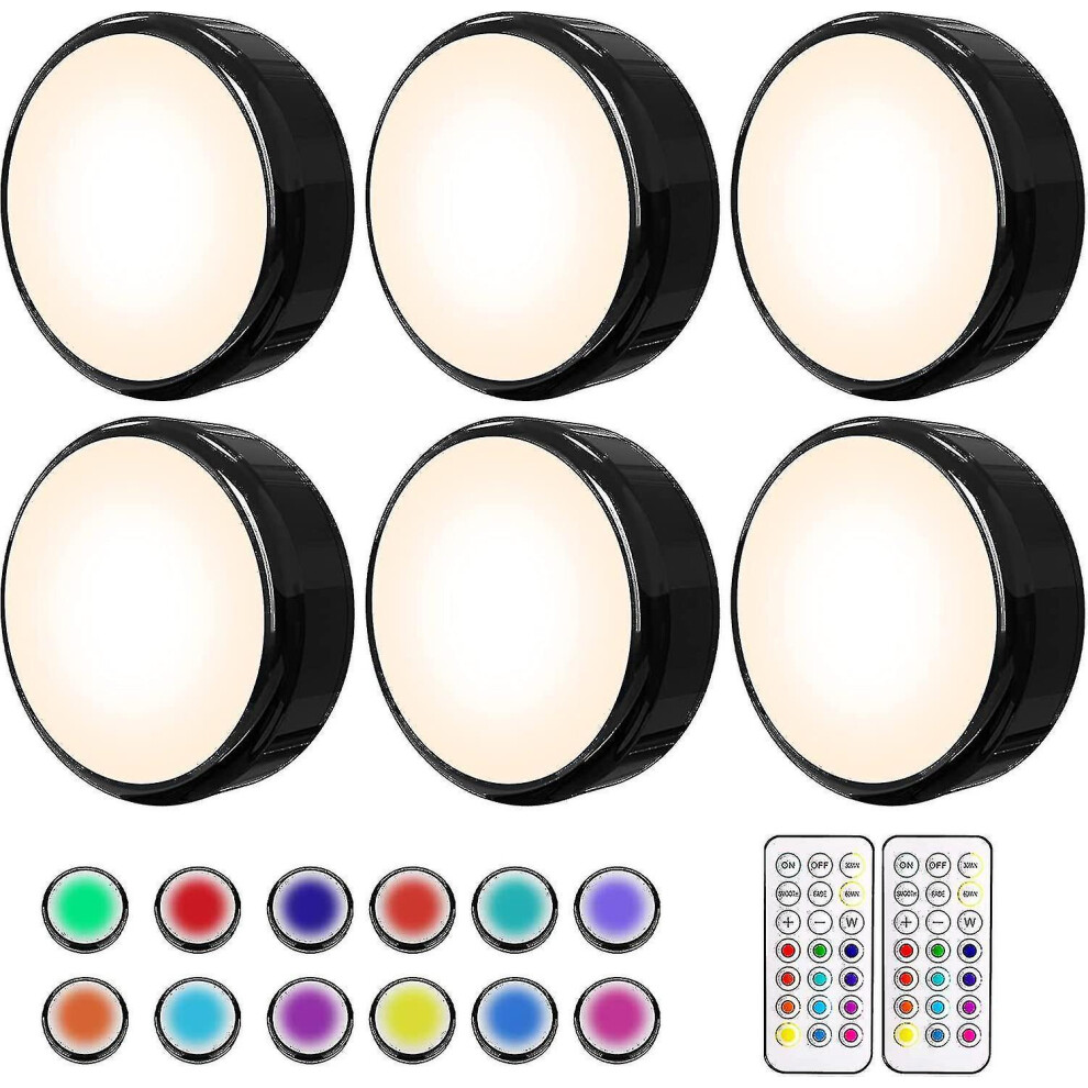 Onumii Under Cupboard Kitchen Lights Battery Operated LED Under Cabinet Lighting, Stick on Wardrobe Lights Under Counter with Remote Control, RGB Puck Light, 6 Pack - Black
