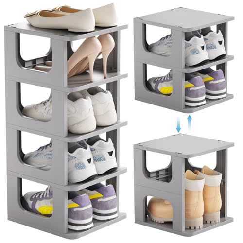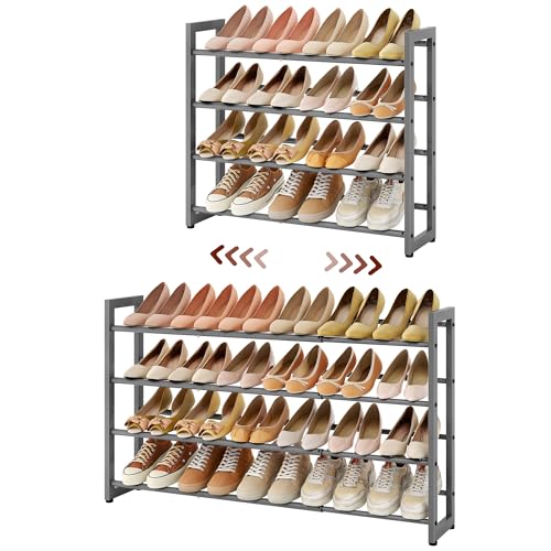 FAVOOSTY 4 Tier Shoe Rack Extendable Metal, Small Shoe Storage Organizer for Closet Inside Wardrobe, Slim Stand Shelf for Narrow Space Under Stairs Hallway, Grey