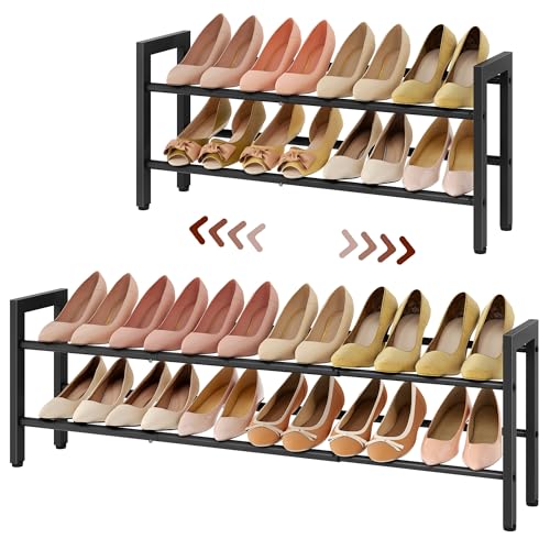 FAVOOSTY 2 Tier Shoe Rack Extendable Metal, Small Shoe Storage Organizer for Closet Inside Wardrobe, Slim Shoe Stand Shelf for Narrow Space Under Stairs Hallway, Black