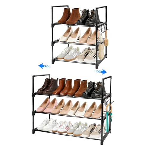 FAVOOSTY 3 Tier Shoe Rack Extendable Metal, Small Shoe Storage Organizer for Closet Inside Wardrobe, Slim Shoe Stand Shelf for Narrow Space Under Stairs Hallway, Black