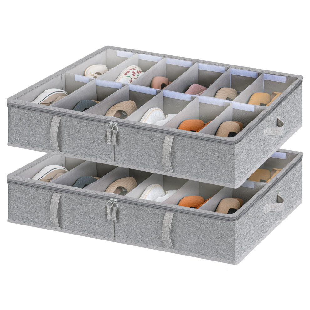 StorageWorks Under Bed Shoe Storage Organizer, Underbed Shoes Container with Adjustable Dividers, Shoe Storage Basket with Cover, Grey, 2-Pack,