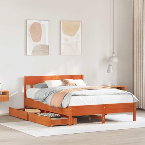 KTHLBRH Solid Pine Wood Bed Frame with 2 Drawers in Wax Brown 140x190 cm, Slatted Base for Mattress Support, Underbed Storage with Wheels, Durable Furniture for Bedroom Organization