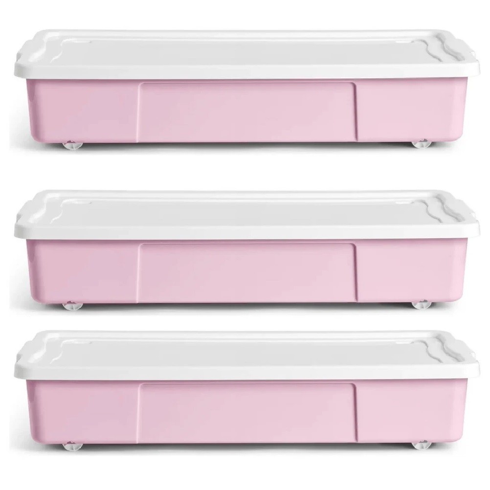 3 Pack Underbed Pink Storage Box With Wheels & Lid Plastic Large Container