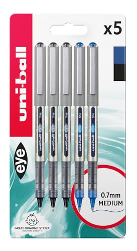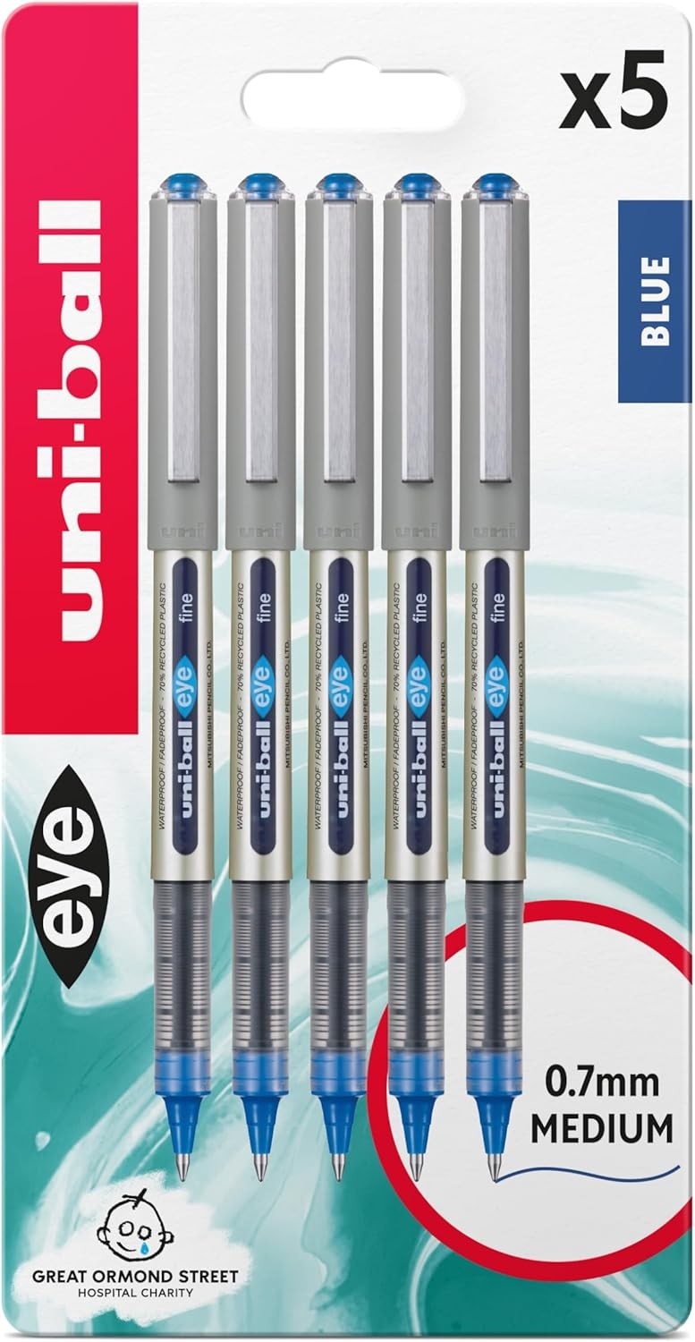 uni-ball UB-157 Eye Rollerball Pens. Premium Fine 0.7mm Ballpoint Tip for Super Smooth Handwriting, Drawing, Art, Crafts and Colouring. Fade and Water Resistant Liquid Uni Super Ink. Pack of 5 Blue