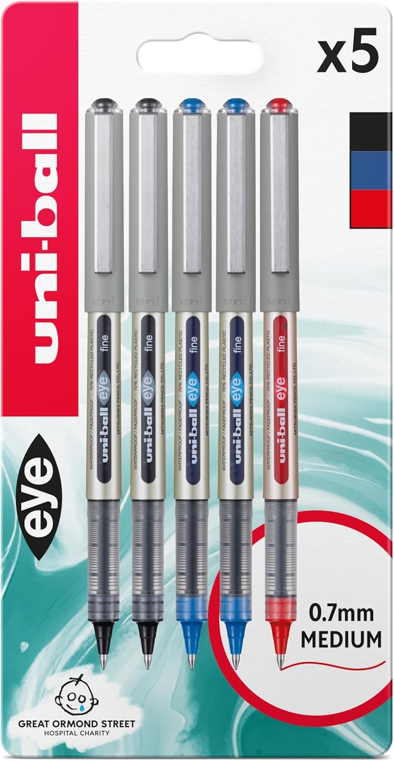 uni-ball EYE - UB-157E Rollerball Pens - 0.7mm Nib - Black, Blue, Red - Pack of 6