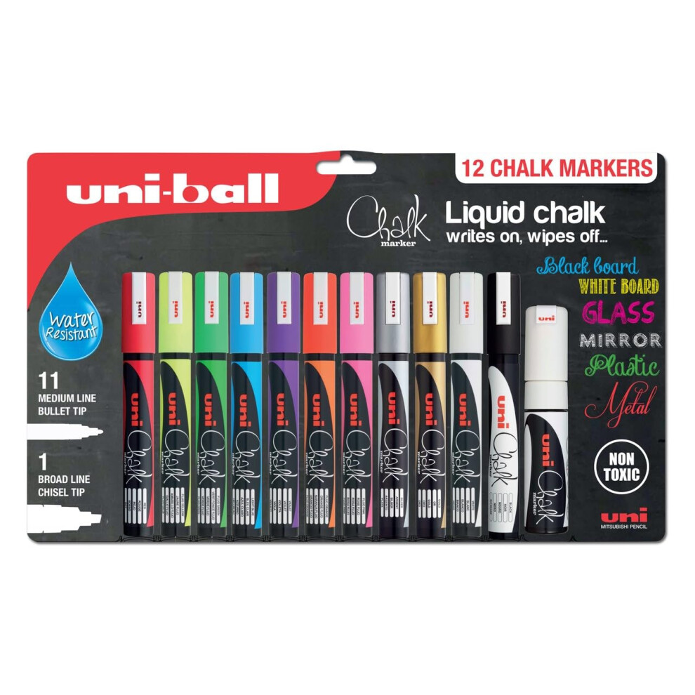uni-ball Liquid Chalk Pens. Multi-Purpose Wipeable and Erasable Coloured Markers for Blackboards Chalkboards Whiteboards Glass Mirrors Plastic Windows Metal. Non Toxic. Multipack Set of 12