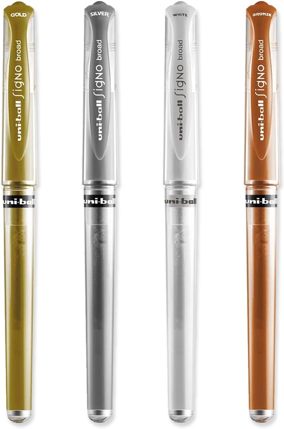 uni-ball Signo Pen Broad Metallic Gel Ink Rollerball - Metal 1mm Tip Nib 0.65mm Line Width With Rubber Grip - UM-153 - (Pack Of 4) - Gold, Silver, White & Bronze