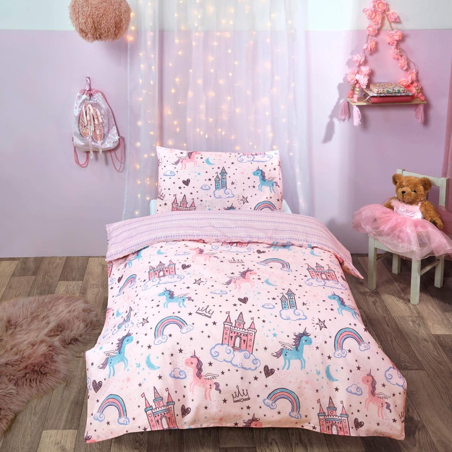 Zappi Co Unicorn Single Bed Duvet Cover Set Includes Duvet Cover (200x135 cm) and Pillowcase (48 x 74 cm) - Perfect for Girls' Beds Fairy Castle Design