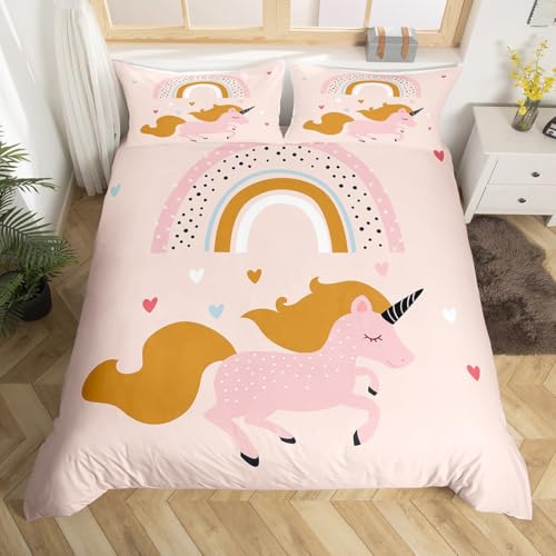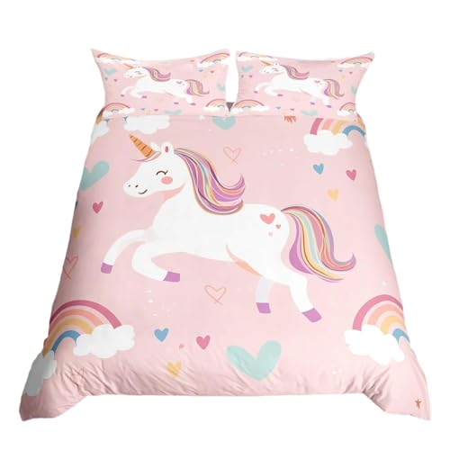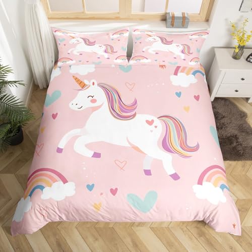 Homewish Cute Unicorn Girl Bedding Double Size, Rainbow Unicorn Duvet Cover Set for Kids Girls, Kawaii Hearts Pattern Quilt Cover Reversible Cartoon Animal Bed Sets, Princess Bedroom Decor