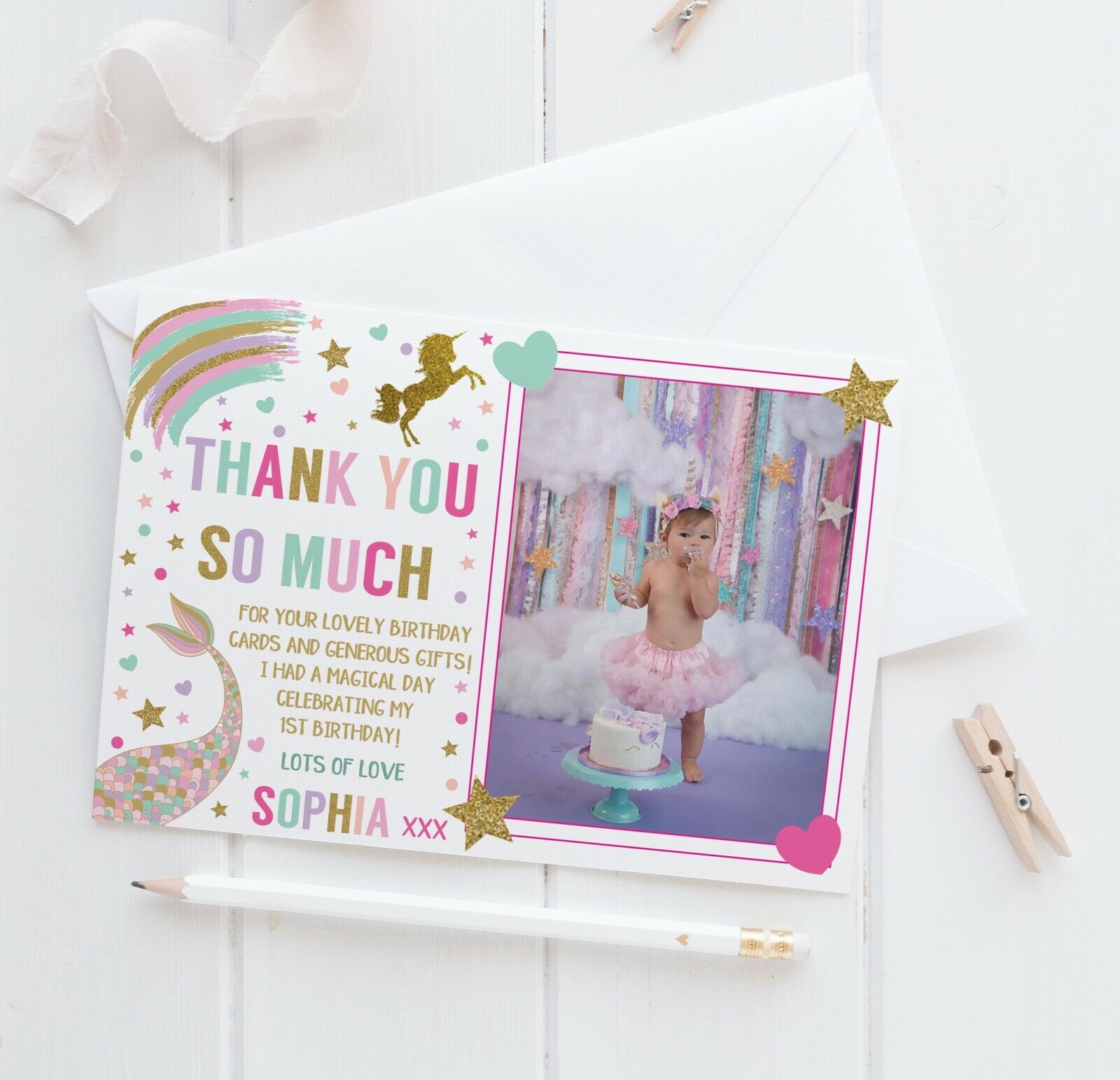 10 Personalised Photo Thank You Cards Unicorn Mermaid Glitter Effect Birthday