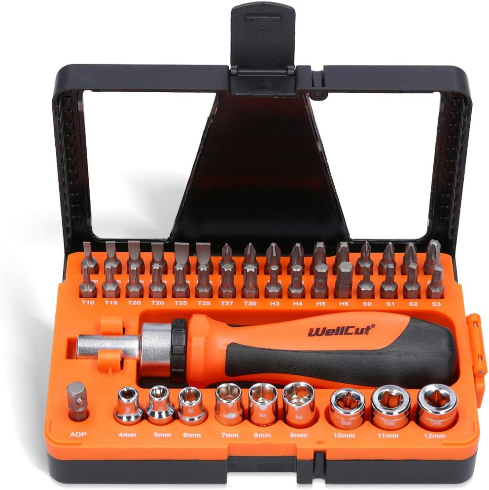 WELLCUT 44 pcs Universal Ratchet and Screwdriver Bit Set with Case, Hex/Torx/Slotted/Phillips/Pozidriv/Square for DIY/Electronics Repair/Hand Tools, WC-RSD44, Orange, Medium