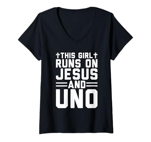 Womens This girl runs on Jesus and uno funny christian card game V-Neck T-Shirt