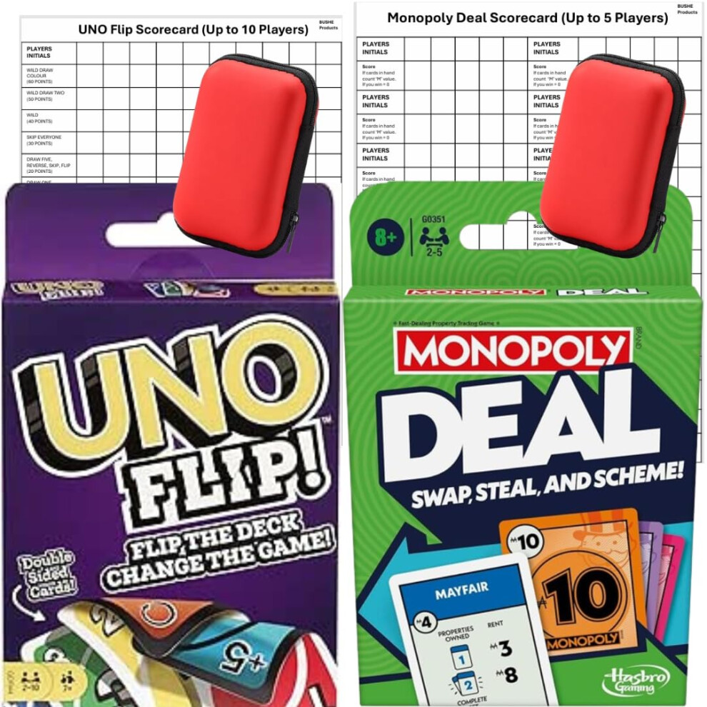 G&C PRODUCTS Uno Flip and Monopoly Deal Card Game Bundle – Travel Card Game Set for Game Nights with Scorecards and Travel Cases – Compact Card Games for Teens and Adults