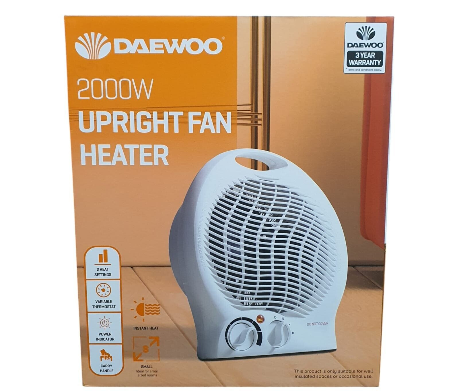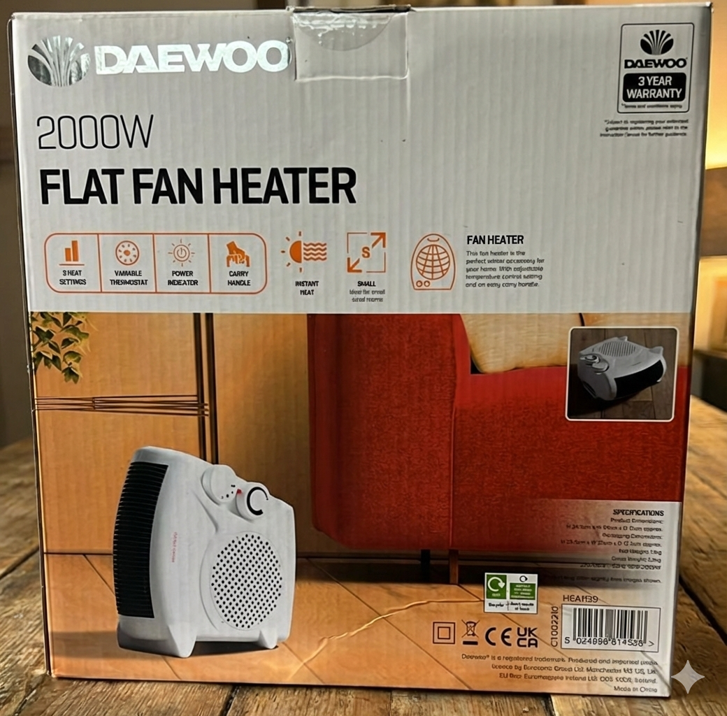 Daewoo 2000W Fan Heater, Upright Fan Heater, Automatic Safety Cut Out, 2 Heat Settings, Variable Thermostat, Power Indicator, Fan Only Setting, Carry Handle, Instant Heat, Ideal For Small Rooms