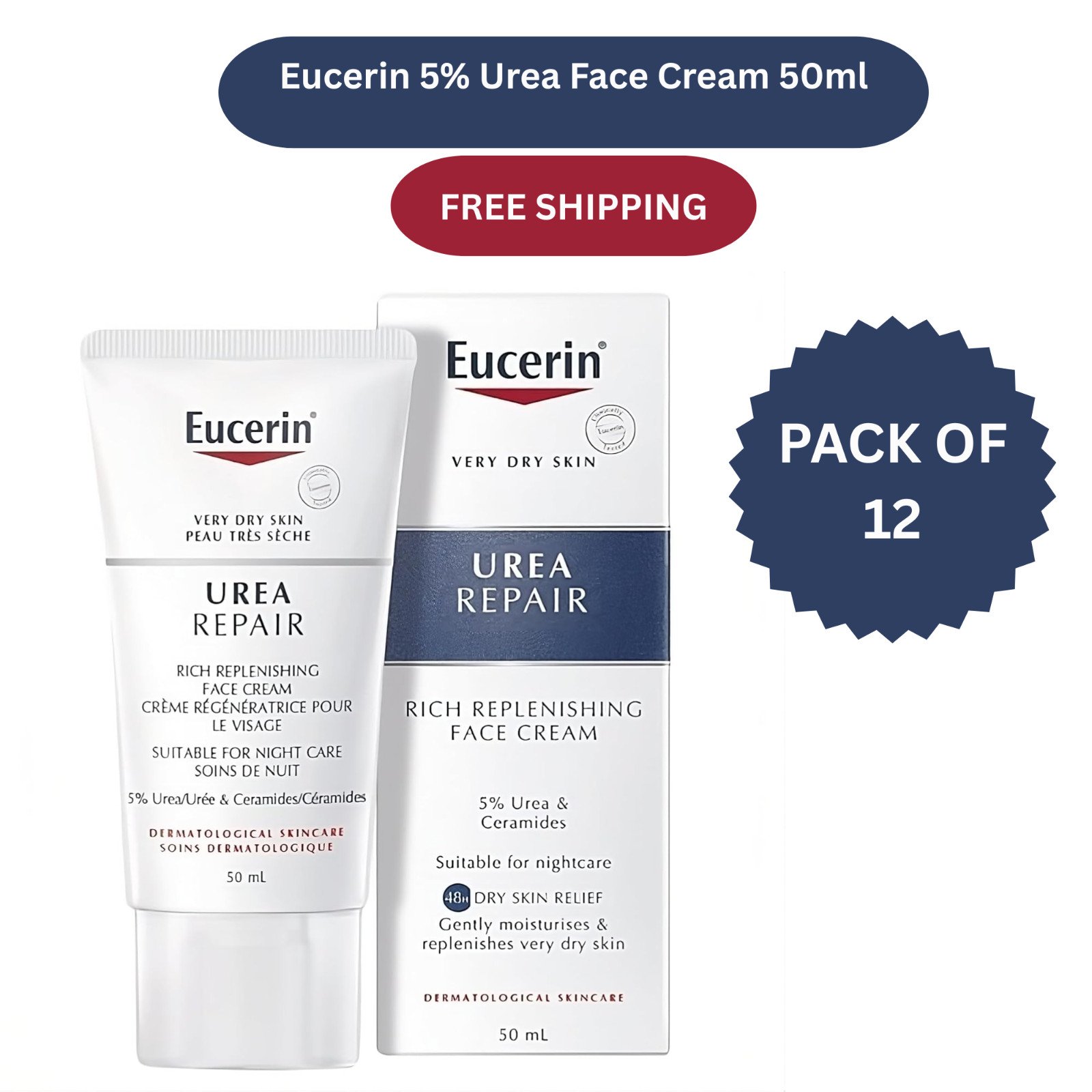 Eucerin 5% Urea Face Cream 50ml - Dry Skin Relief Moisturiser Bundle PACK OF 12