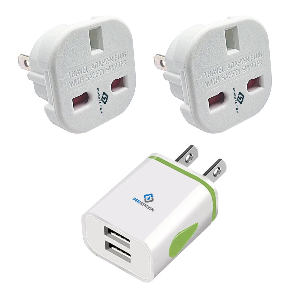 Pipestation US to UK USB Travel Adapter Charger with 2x USA to UK Travel Adaptors | 2-Pin America Adaptor with 2 USB Ports | 3-Pin to American 2 Flat