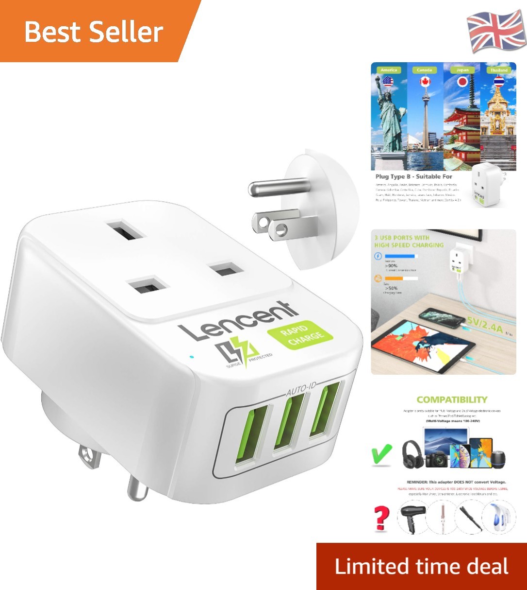 LENCENT 2 Way USA Travel Plug Adapter Type B from UK to USA Canada Mexico w/ USB