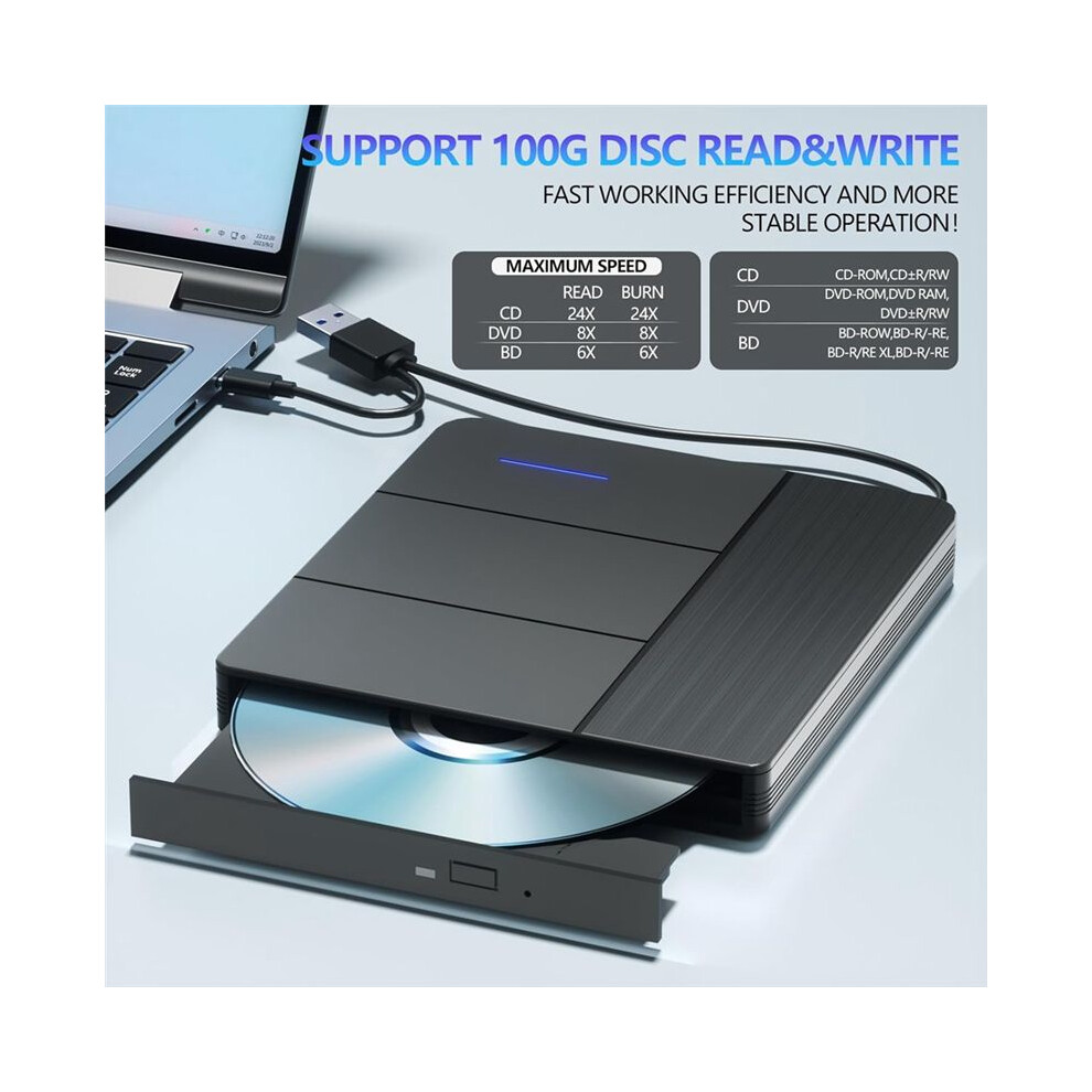 Portable Blu-ray Drive USB 3.0 & Type-C, DVD/BD Read/Write, compatible with Win7/8/10/11, External Blue Ray Player