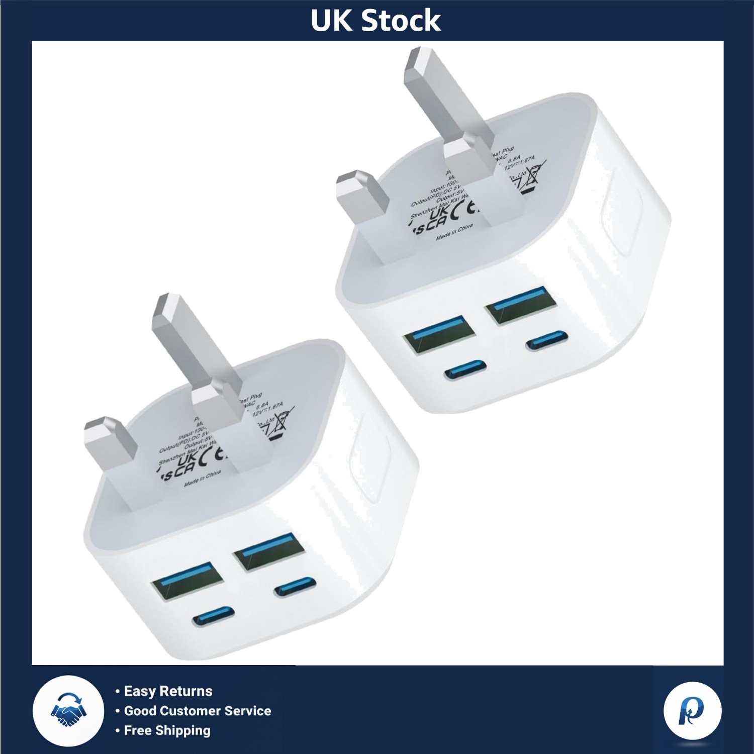 Powerful 40W 4-Port USB-C Wall Charger Plug Fast Charge UK 2 Pack