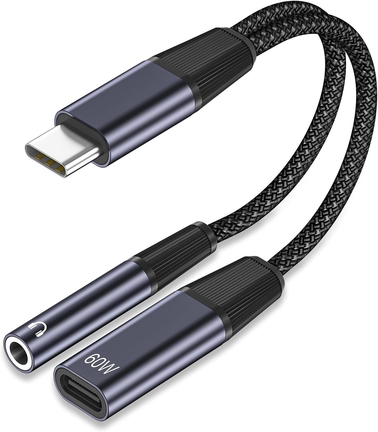 USB C to 3.5mm Jack and Charger Adapter,2 in 1 Type C to Aux and Charger Splitter with PD 60W Fast Charging and Data Transfer,Type C to Jack Aux Headphone Dongle for iPhone 16/15 Pro,iPad Pro,Huawei