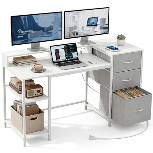 YITAHOME Computer Desk with Drawers Power Outlet, Home Office Desk with 2 Sockets & USB Ports, Computer Table with Storage & Shelves, Study Table Corner Desk with File Drawer, White