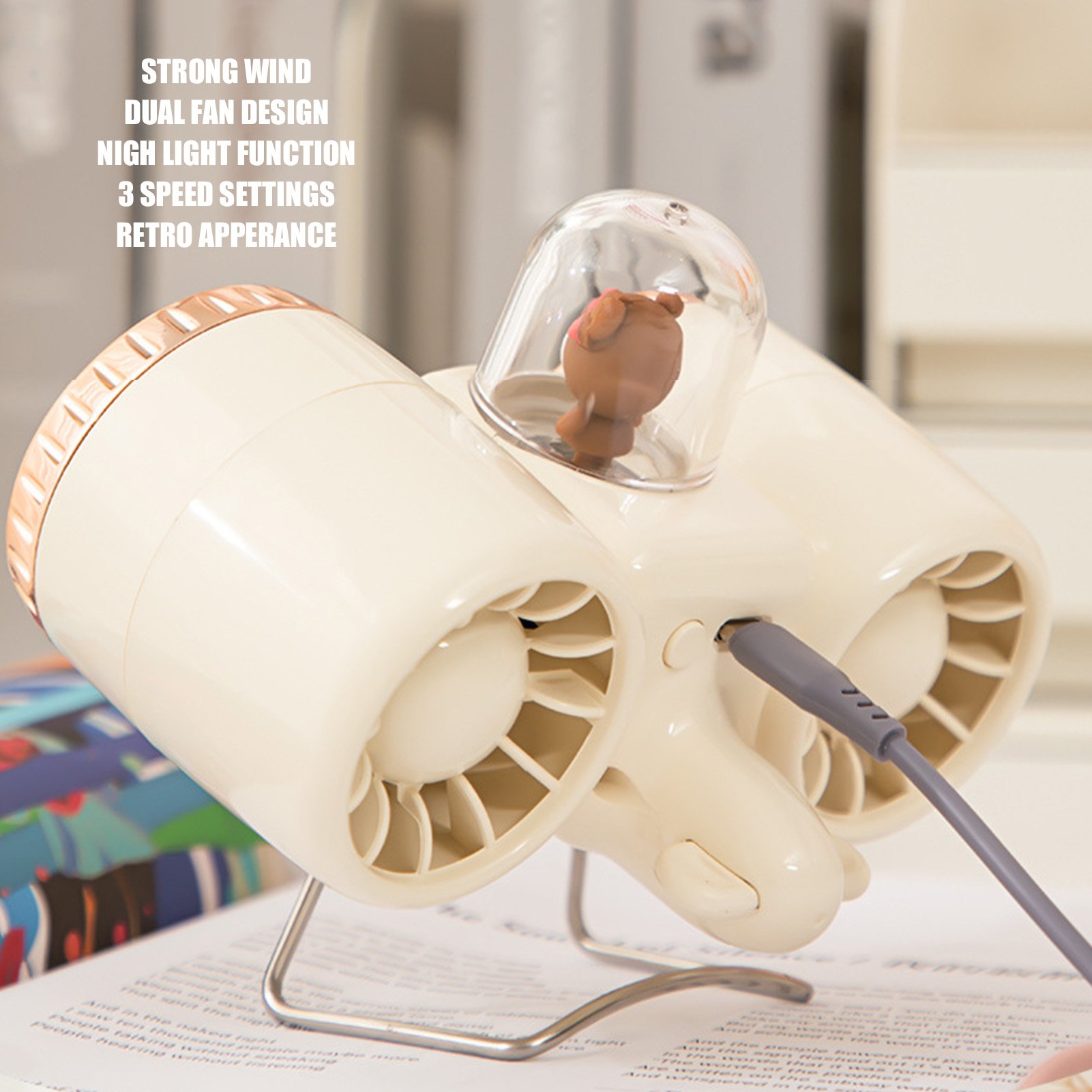 USB Desk Fan Dual Blade Bear Design 3 Speeds Strong Wind USB Charging Night Ligh