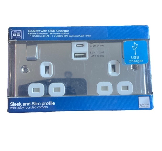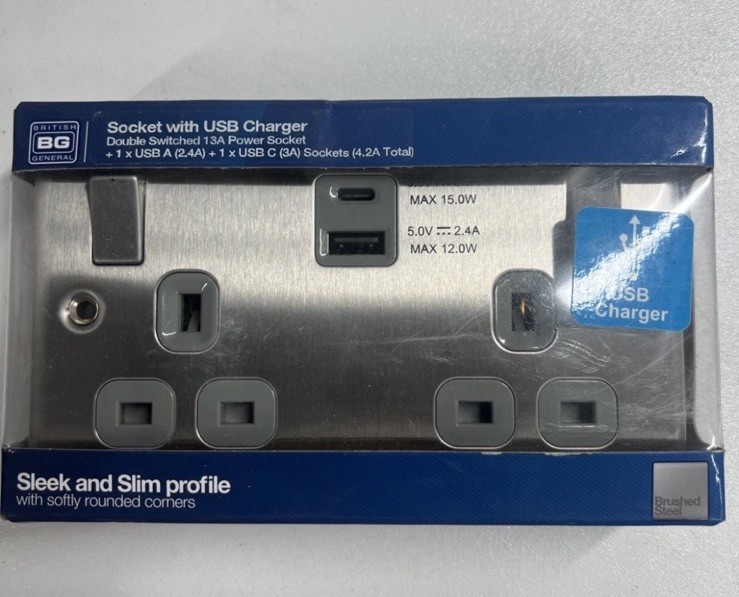 BG Metal Clad 13A Double Switched Power Socket with USB Charging USB A+C Socket (4.2A)