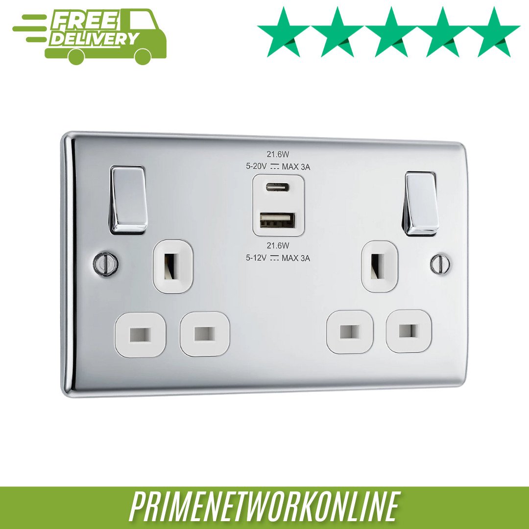 BG Polished Chrome USB C + USB A Power Plug Socket 22W Double Switch 13A