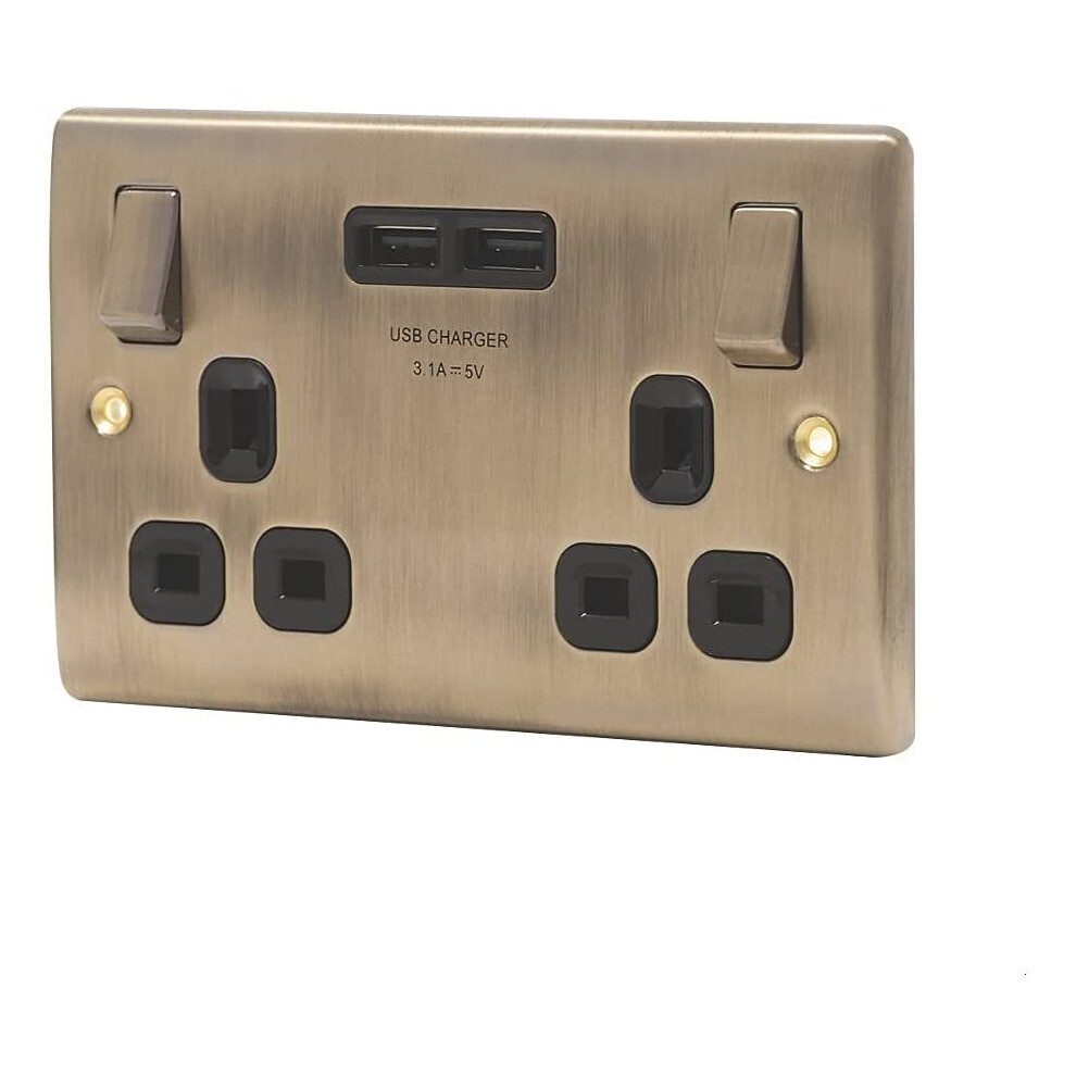 BG Electrical NAB22U3B Nexus Metal Antique Brass Double Switched 13A Power Socket With USB Charging - 2X USB Sockets (3.1A) Black Insert - 5 Pack