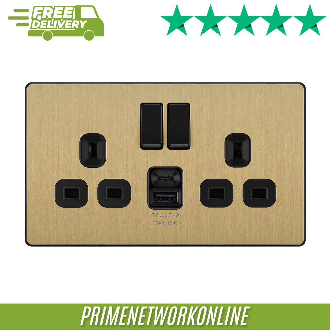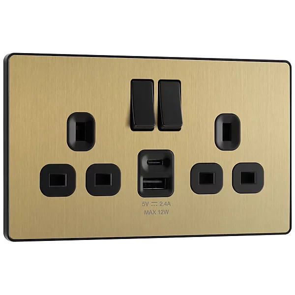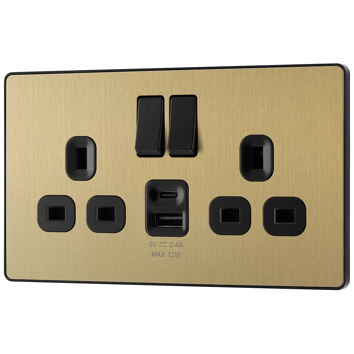 BG Satin Brass Double 13A Raised Slim Switched Socket + 12W USB C + USB A ⭐⭐⭐⭐⭐