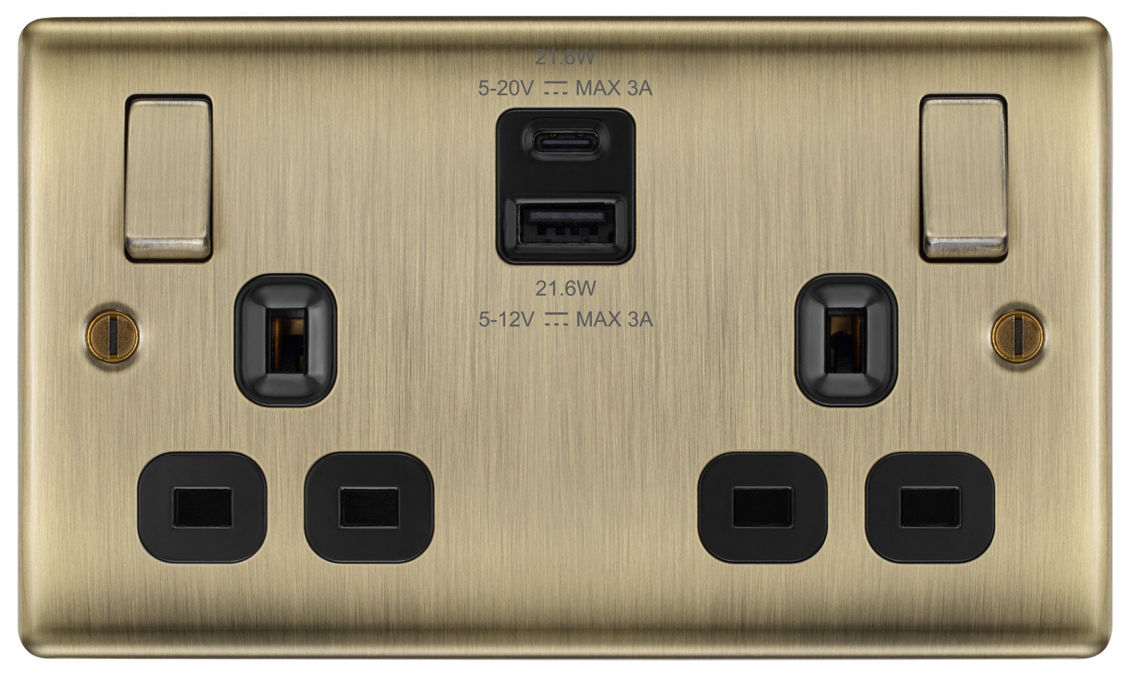 BG NAB22UAC22B Antique Brass Double Socket with USB 22W Type A & Type C USB